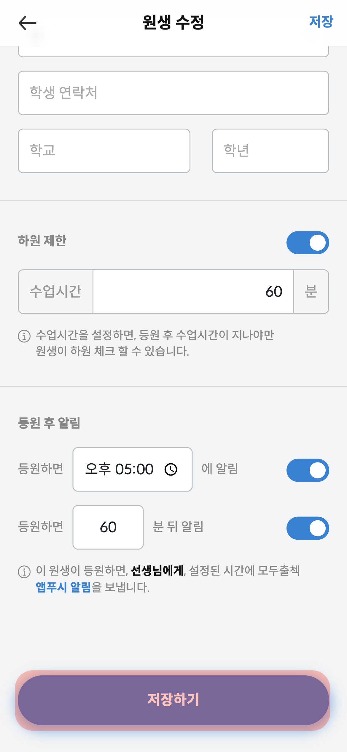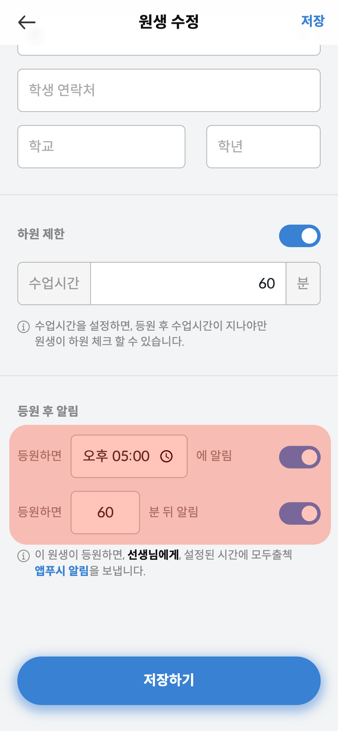 저장을 클릭하면 등원 후 알림이 설정되며, 설정한 시간에 앱 푸시로 알림이 옵니다.