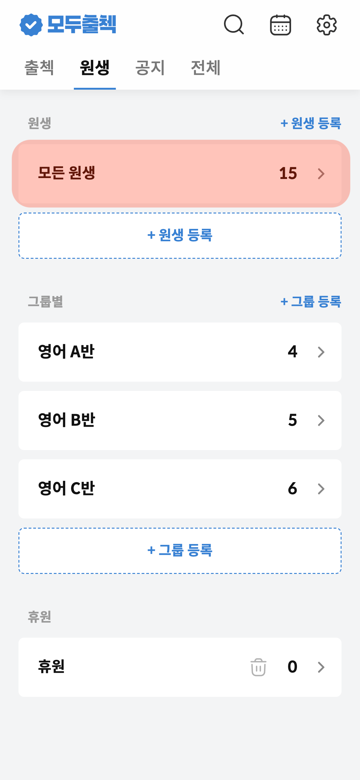 출결모드 실행 후 출결/원생 탭에서 원생을 조회해 주세요.