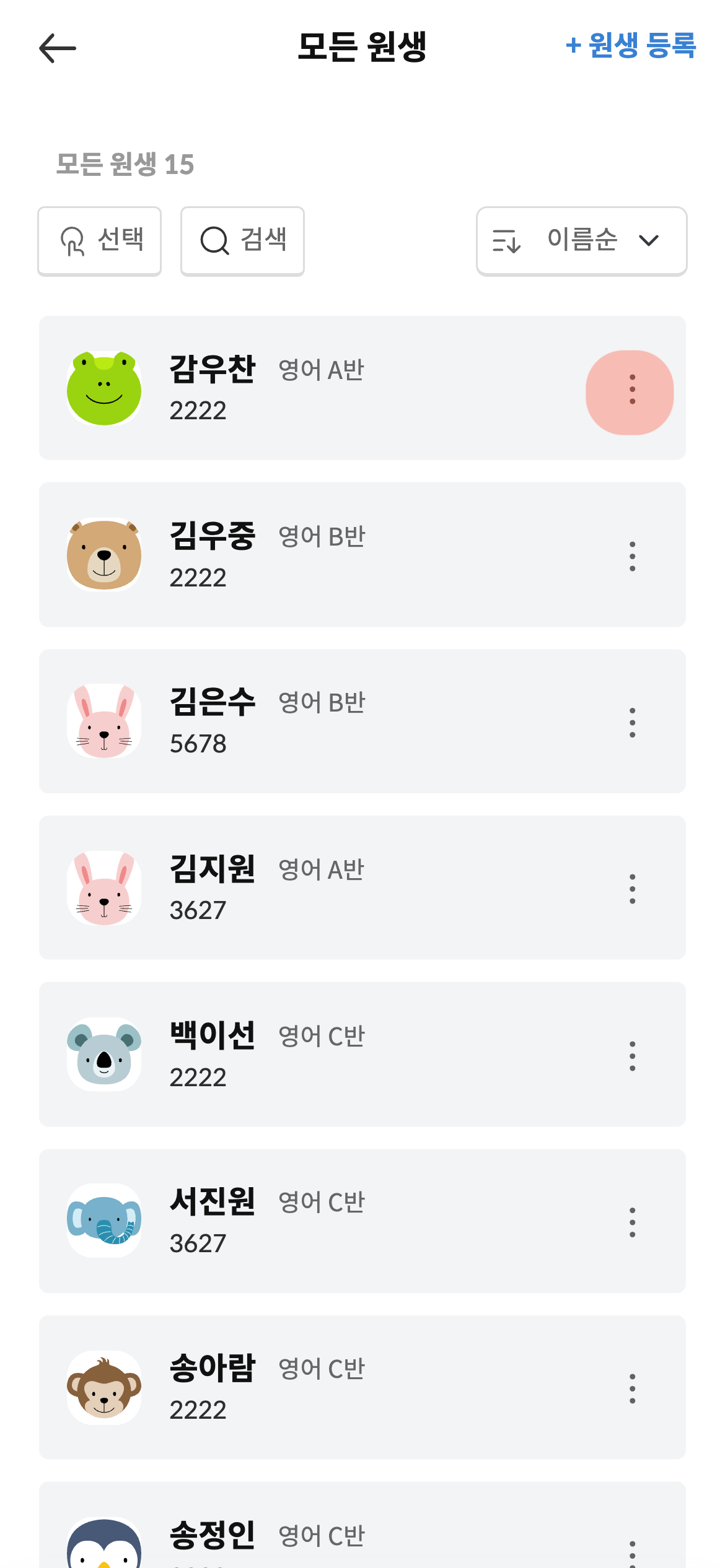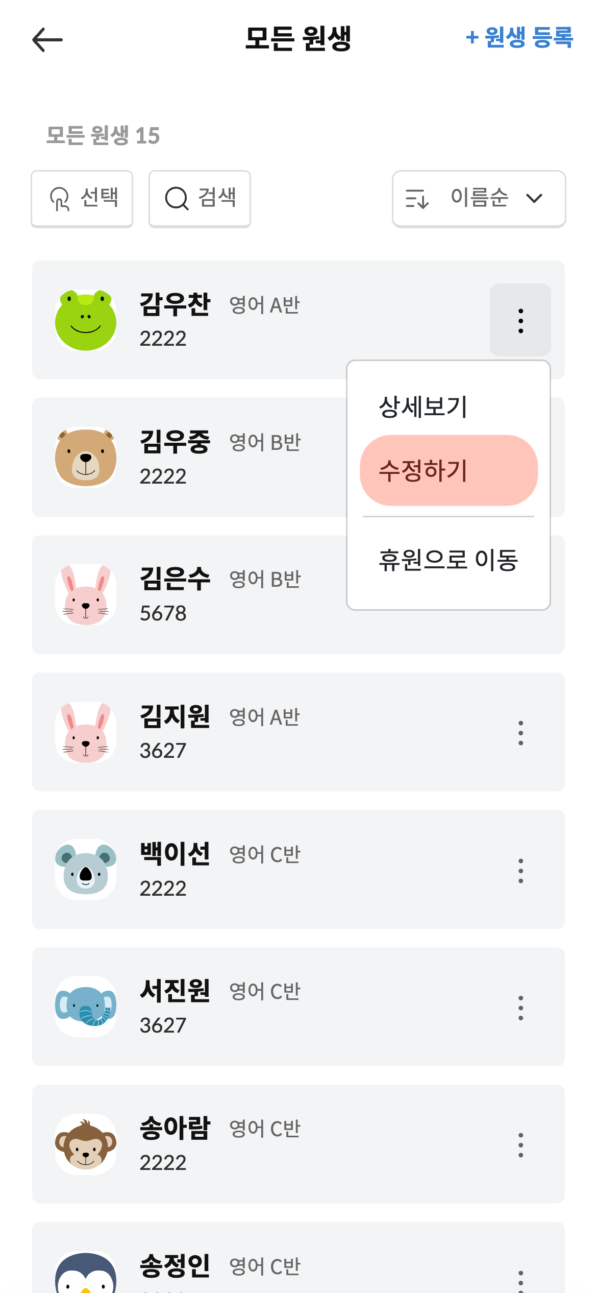 원생의 더보기 버튼을 눌러 수정하기를 선택하세요.