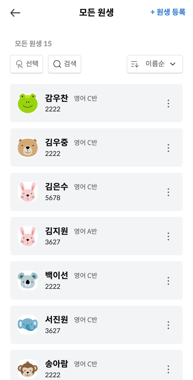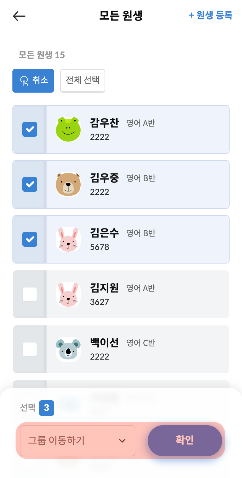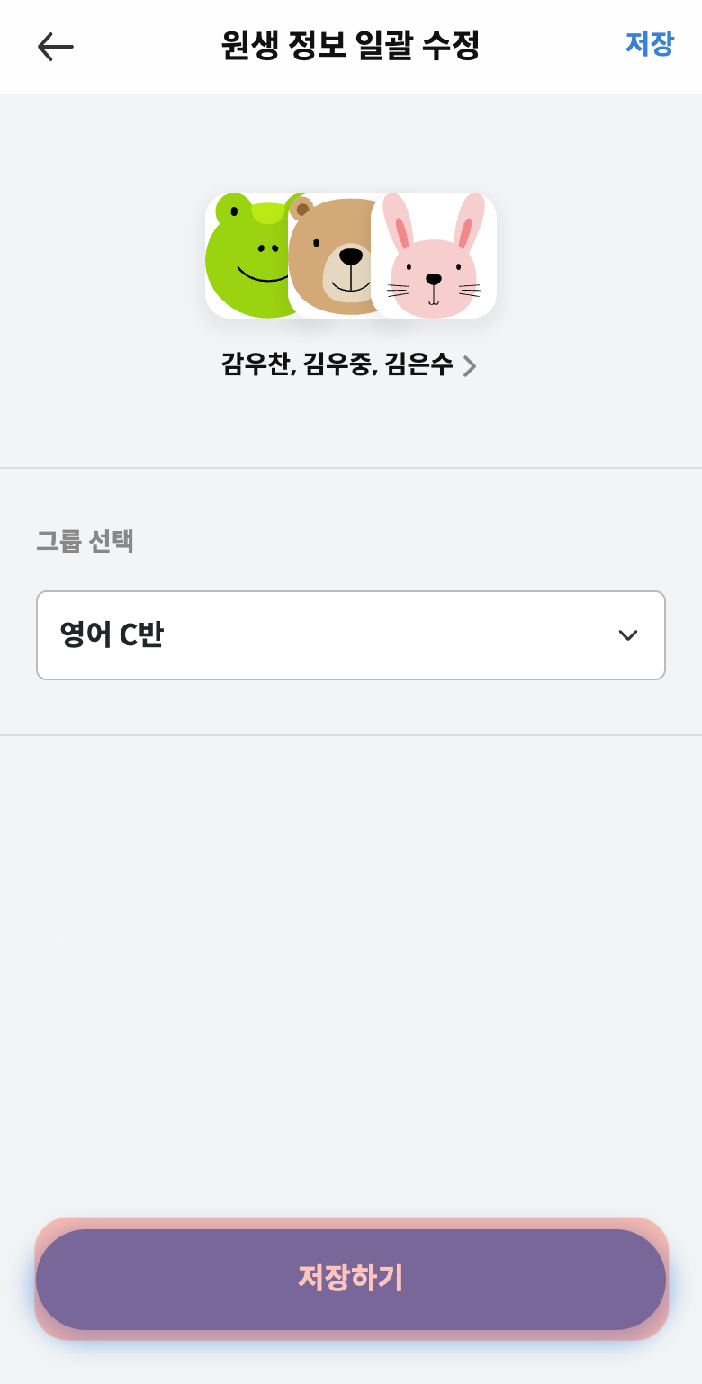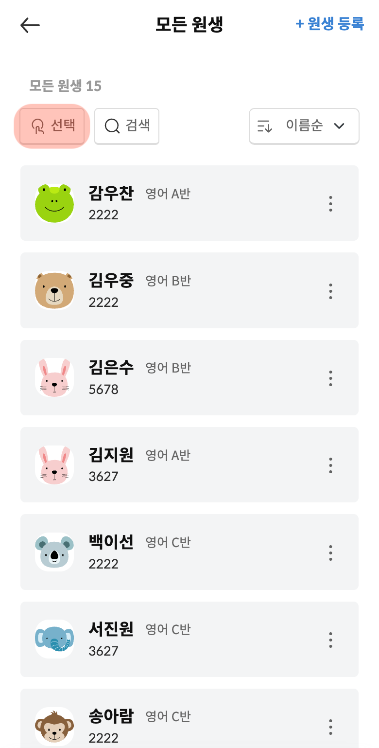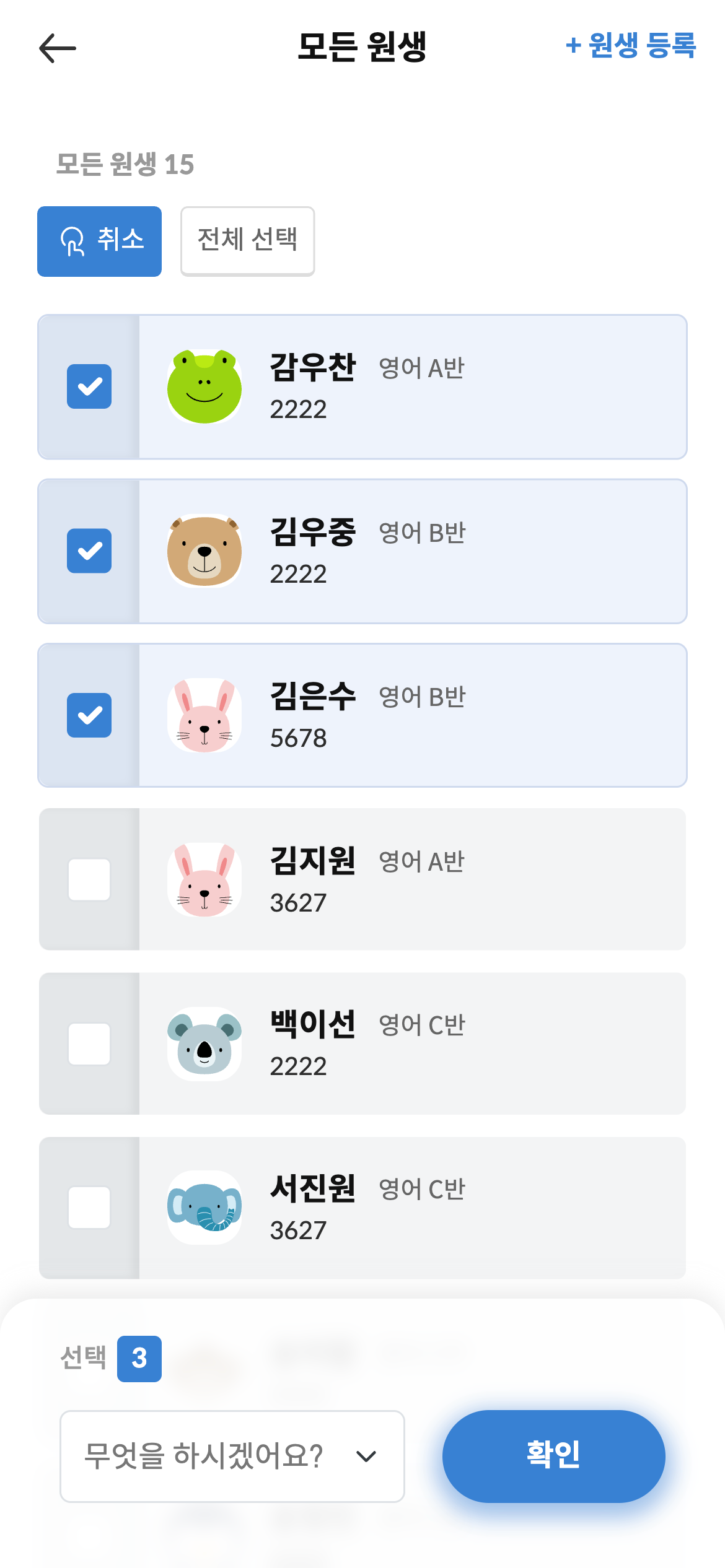 원생 리스트 상단의 선택을 눌러 정보를 변경하고 싶은 원생들을 선택해 주세요