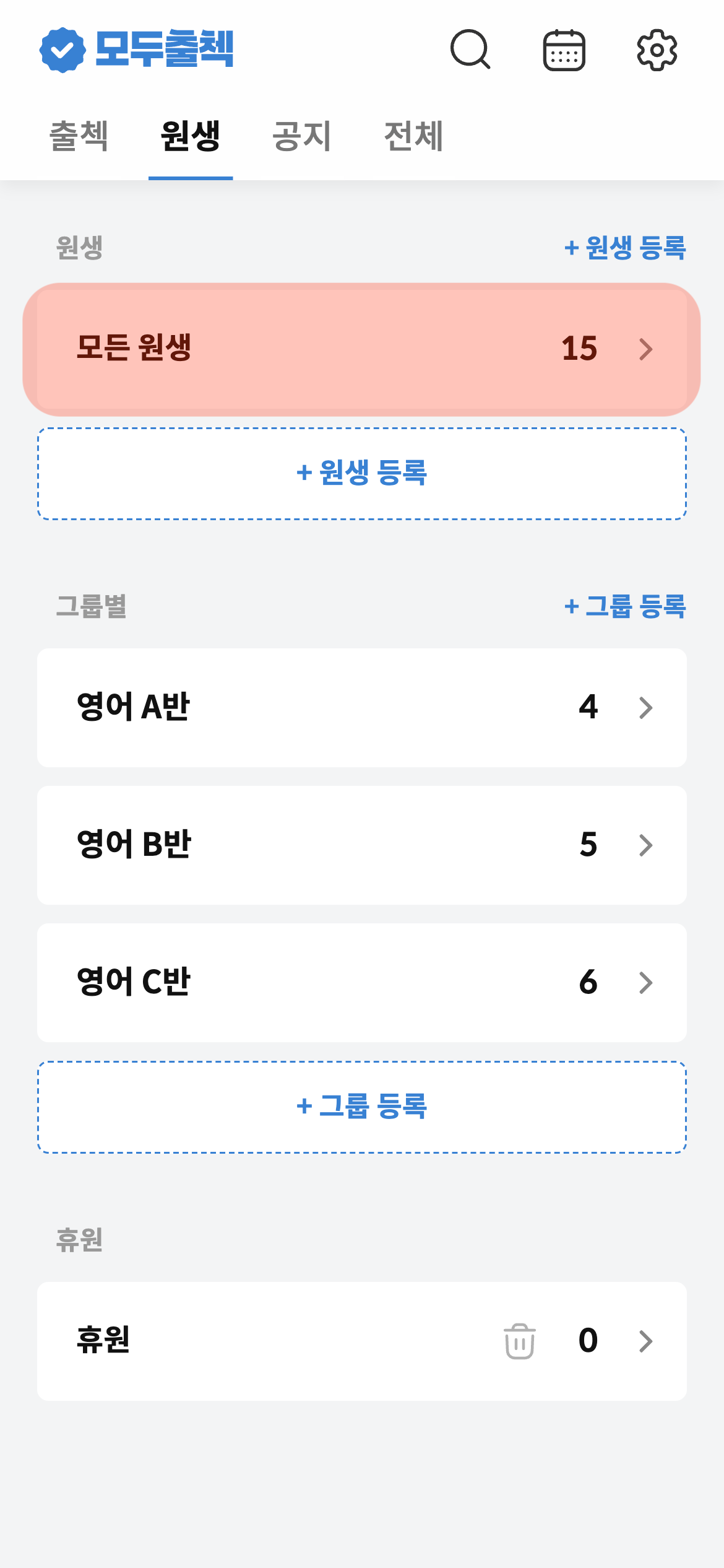 출결모드 실행 후 출결/원생 탭에서 원생을 조회해 주세요.