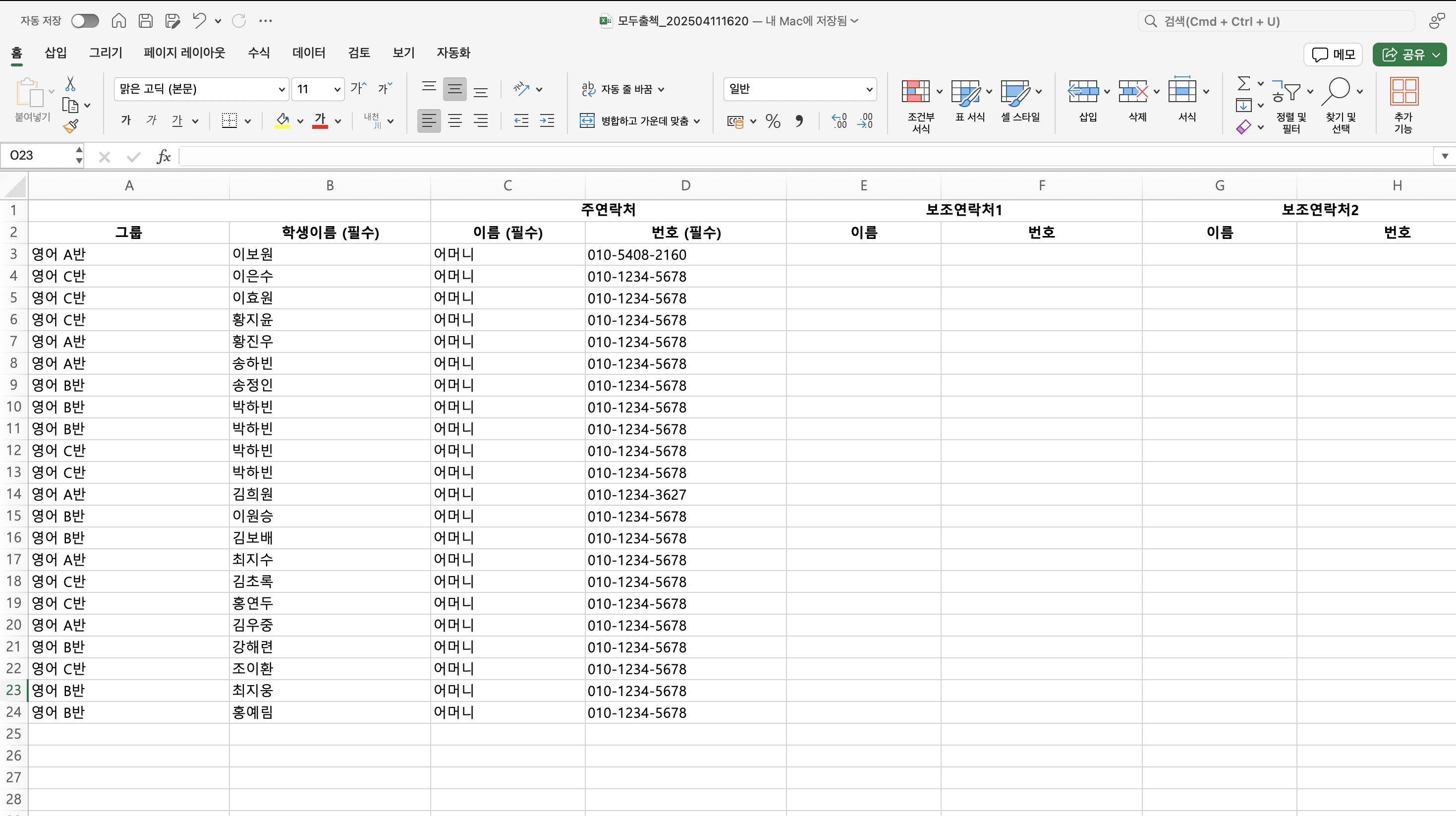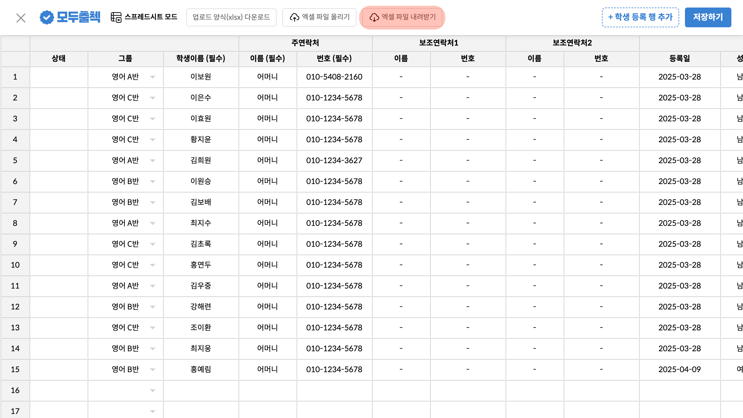등록된 학생 정보가 엑셀 파일로 다운로드 됩니다. 학생 정보를 간편하게 관리해 보세요!