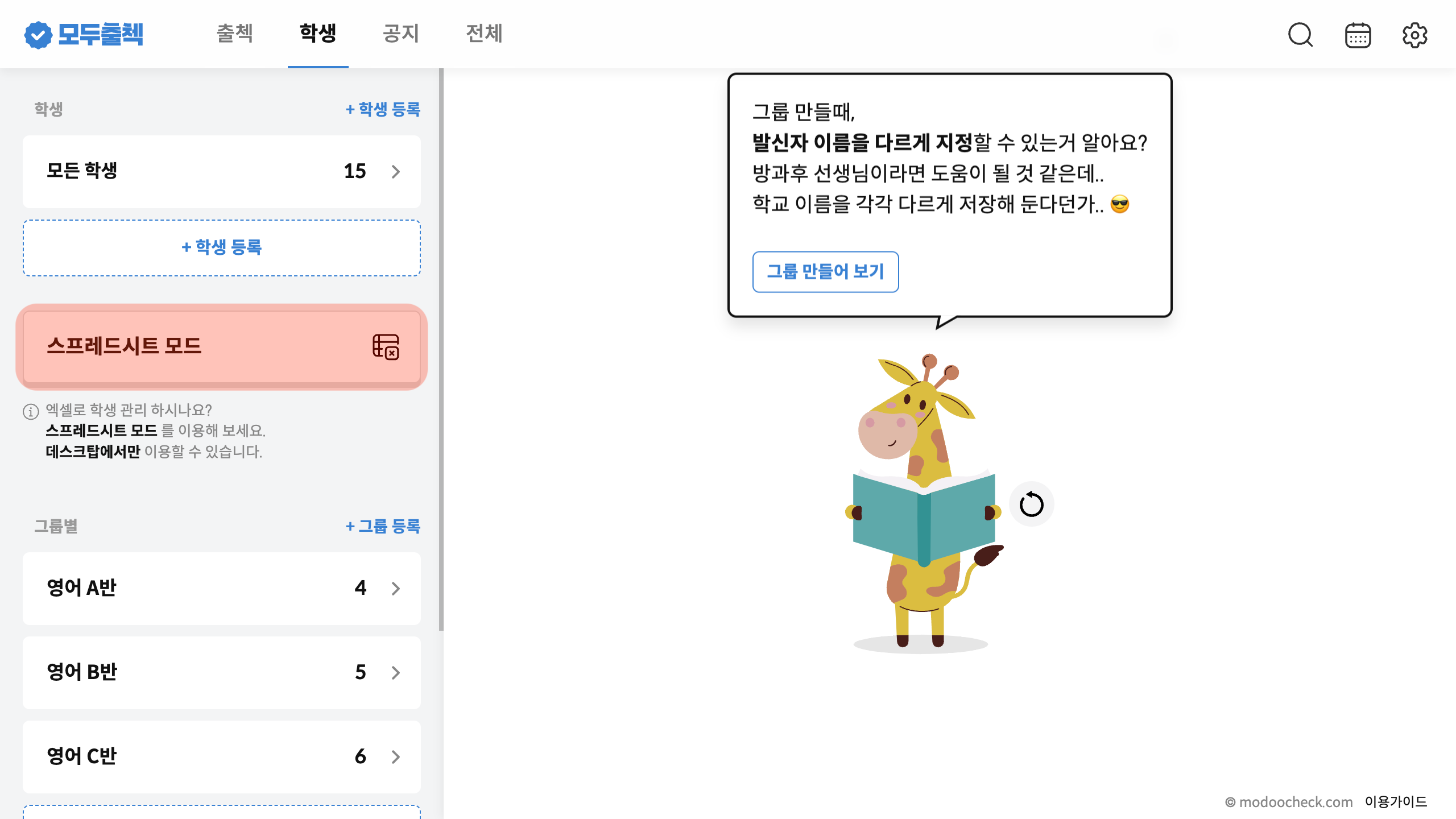 PC에서 관리모드 실행 후 원생탭을 선택하고 스프레드시트 모드를 눌러 주세요.