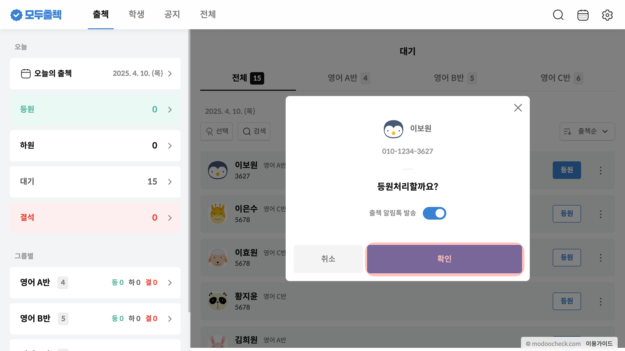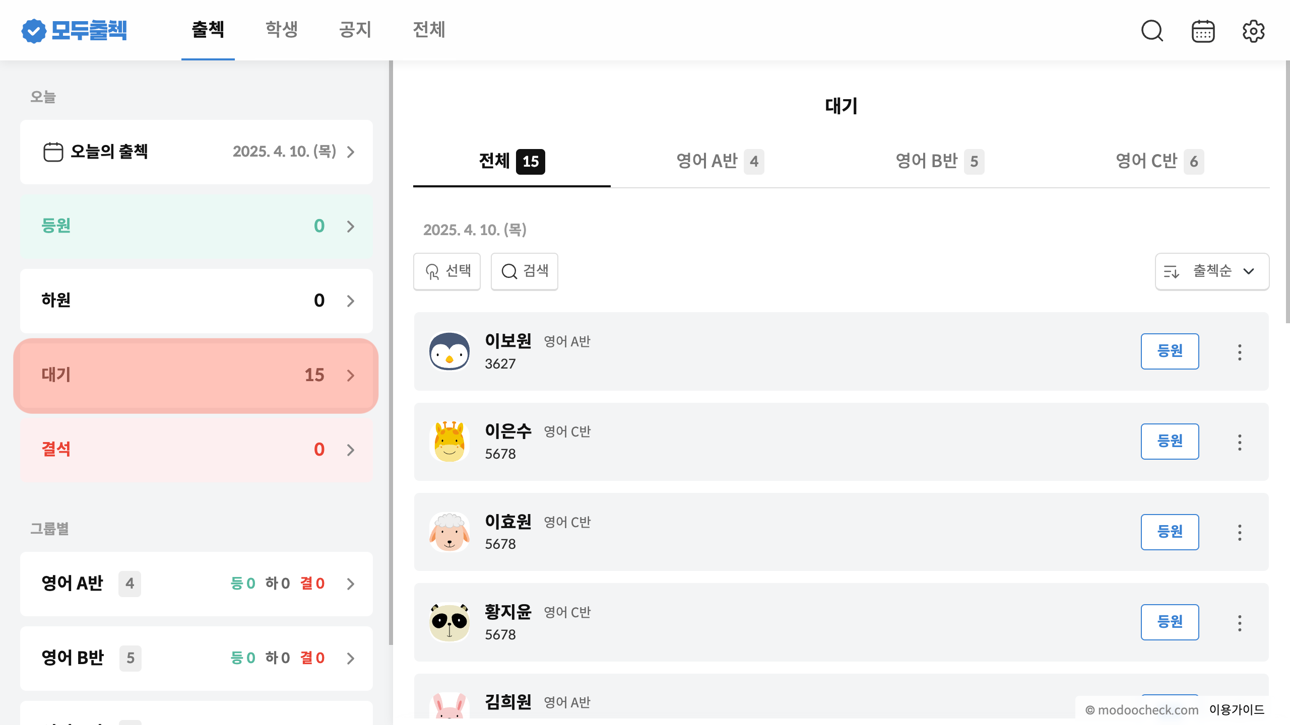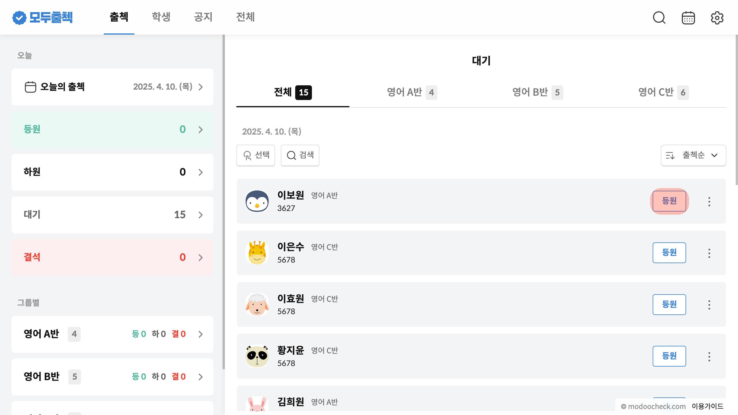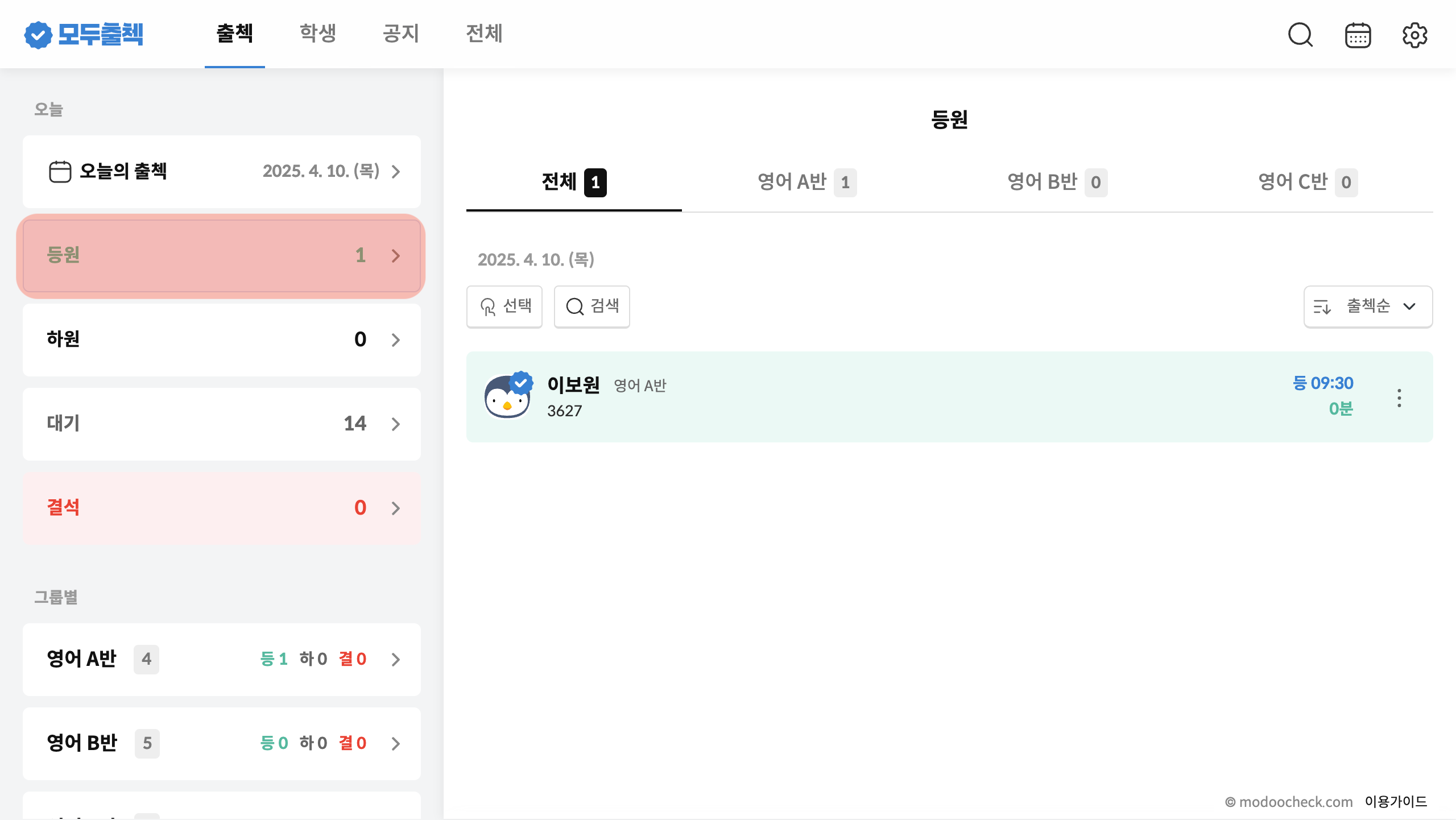 출첵이 완료되며, 등원한 원생은 출첵 탭의 등원을 눌러 확인할 수 있습니다.