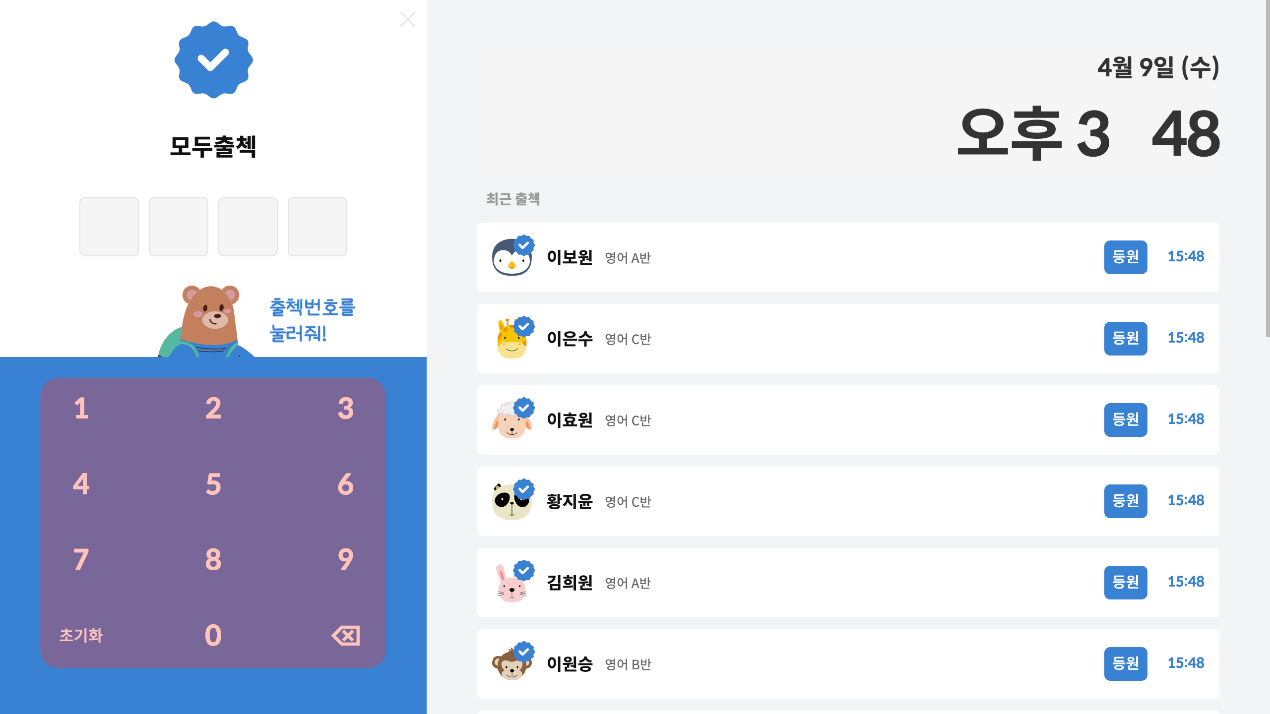 원생정보에 등록된 학부모 연락처의 뒷번호 4자리를 키패드에 입력해 주세요.