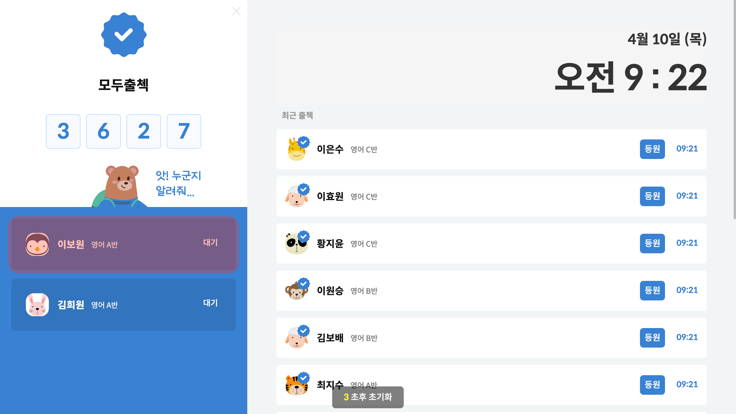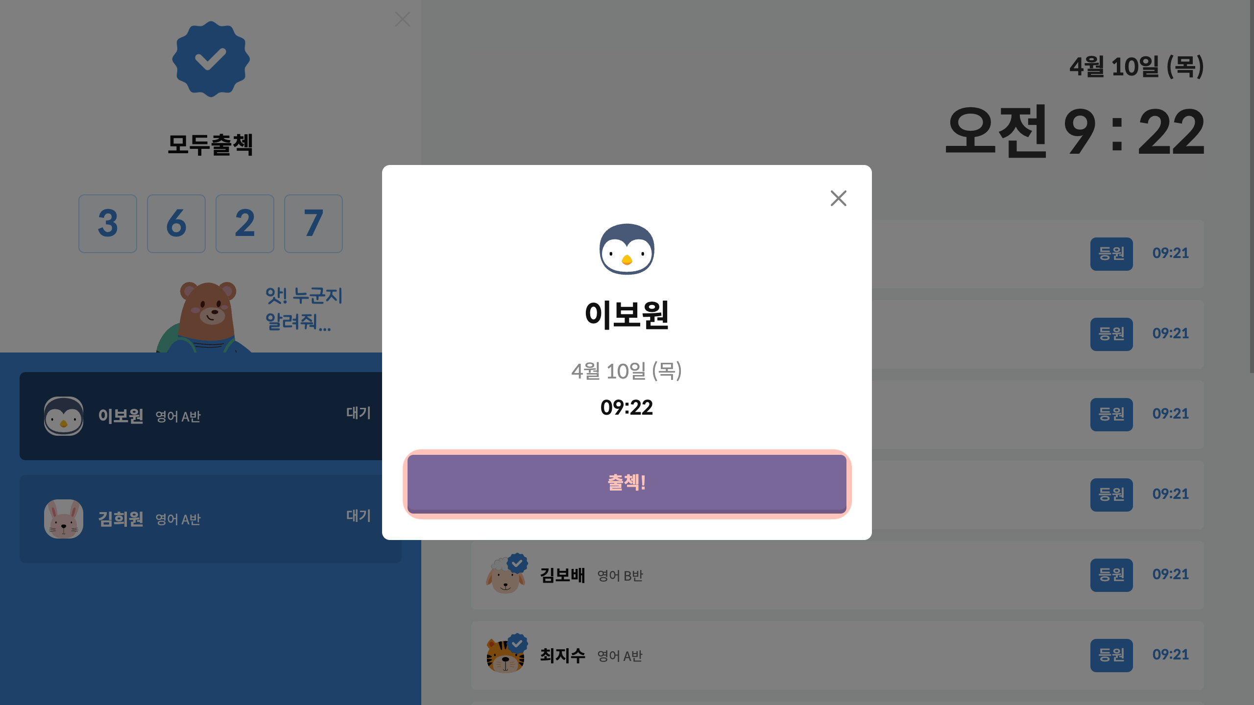 출결을 체크할 원생을 눌러 주세요.