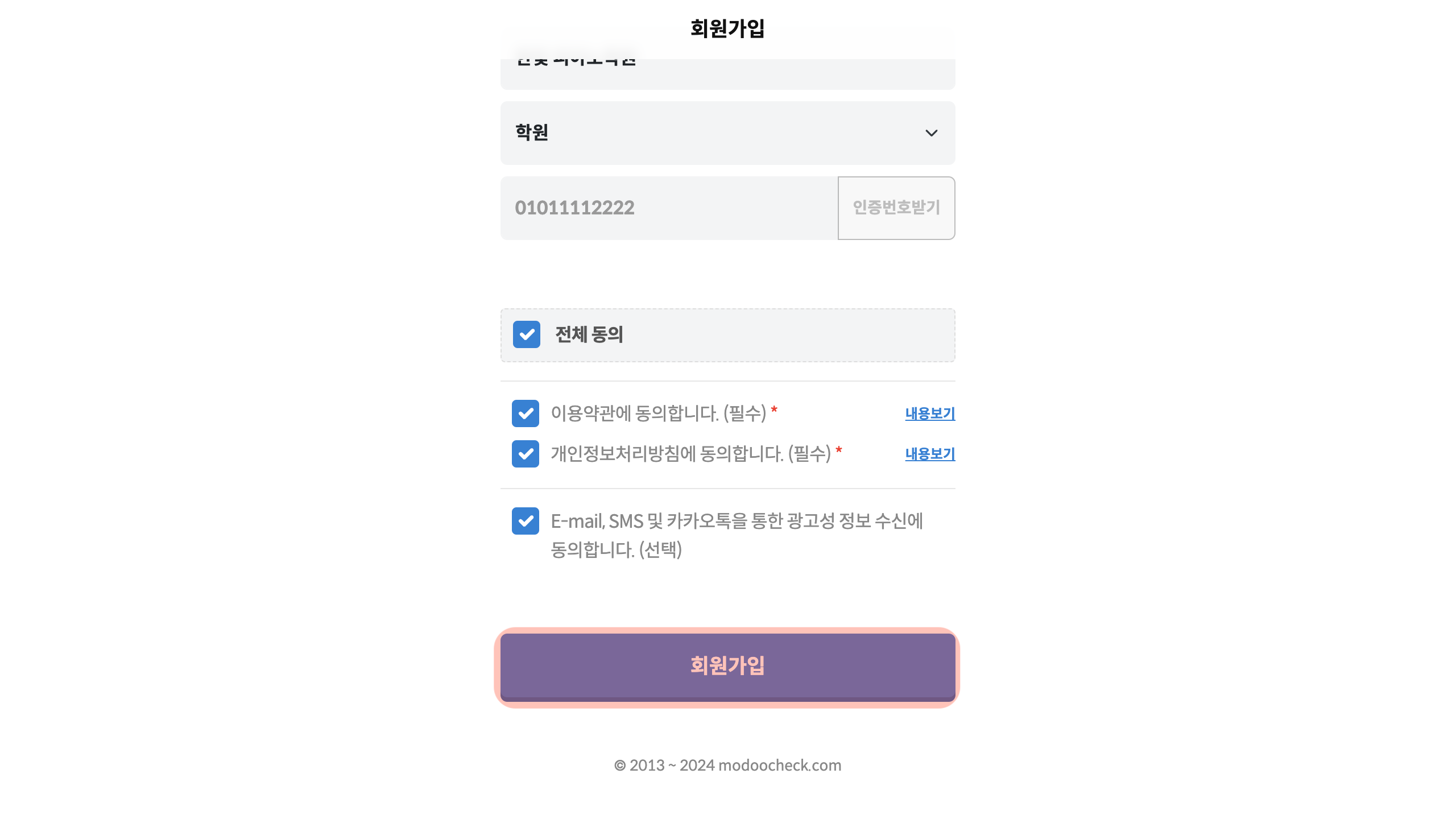 회원가입을 누르면 가입이 완료되며 로그인페이지로 이동합니다. 바로 시작해 보세요!